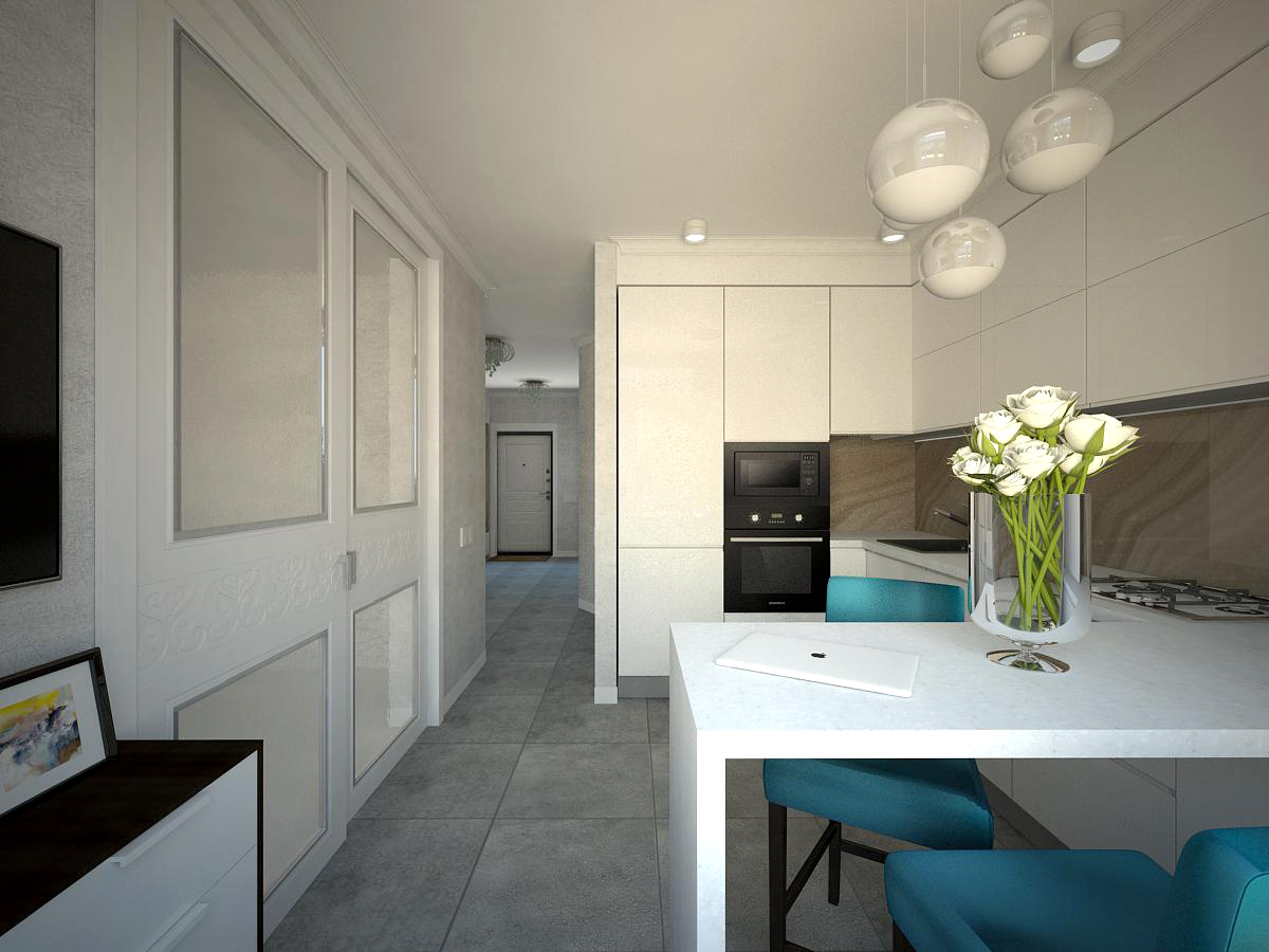 Особый шарм кухне придает сочетание материалов - глянцевый керамогранит от Roberto Cavalli на фартуке, глубокий серый матовый цвет напольного покрытия и шелковистое декоративное покрытие на стенах - прекрасно гармонируют с белой глянцевой кухней. А бирюзовые стулья и сиреневые шторы задают интерьеру настроение.